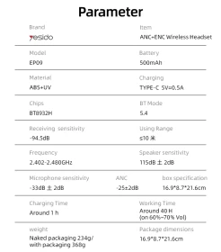 سماعة بلوتوث للرأس من يوسيدو مع خاصية عزل الضوضاء والأصوات المحيطة. - اللون: أسود - الموديل: EP09 - سعة البطارية: 500 ميللي امبير - وقت الشحن: 1 ساعة - مدة التشغيل: 40 ساعة