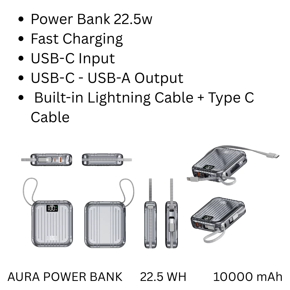 Power Bank 22.5w Fast Charging - USB-C Input - USB-C - USB-A Output - Built-in Lightning Cable + Type C Cable