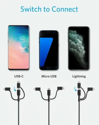 • Built-in Micro USB, USB-C, and Lightning connectors.
